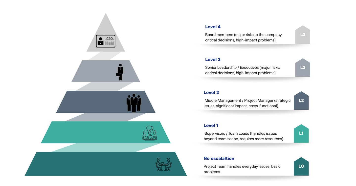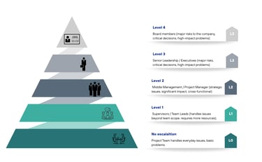An escalation pyramid in project management is a hierarchical model showing communication levels for issues beyond a team's scope, moving from front-line staff (Level 1) up through supervisors, managers, and senior leadership (top). It provides clear "who handles what" guidelines, defining authority for solving problems, preventing bottlenecks, and ensuring timely resolution by only moving issues up when a lower level can't resolve them, using defined criteria like risk or cost.