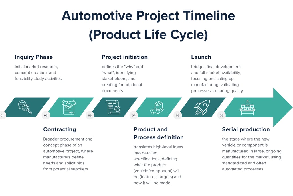 In automotive projects, these stages must account for variables like fluctuating material prices, supplier reliability, and compliance costs. In the Product Life Cycle the Cost Estimation phase is set in Inquiry Phase, the Budgeting is done with Project initiation, while the Cost control is done trough the Product / Process defintion and Launch phase.