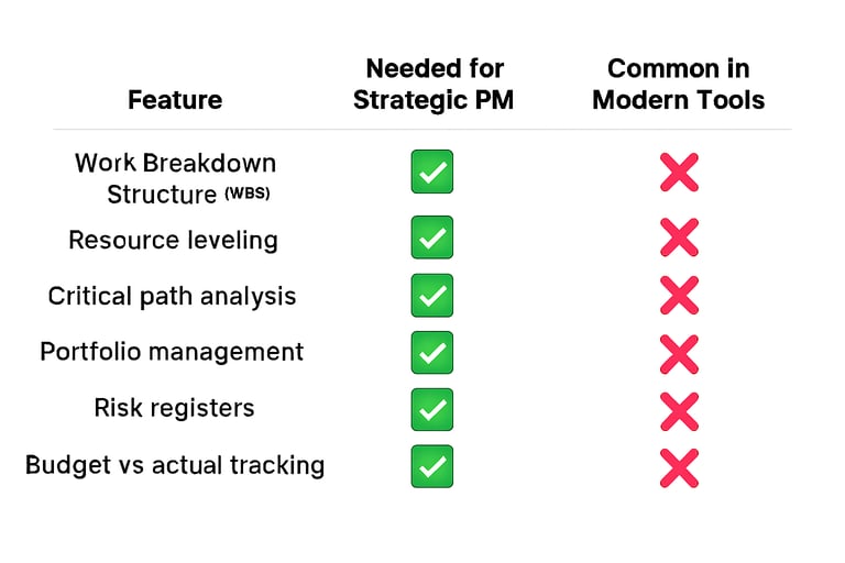 Most modern tools are glorified to-do lists with a Kanban skin. They’re great for visualizing workflows, assigning tasks, and checking boxes — but that’s not project management. Real PM involves:
